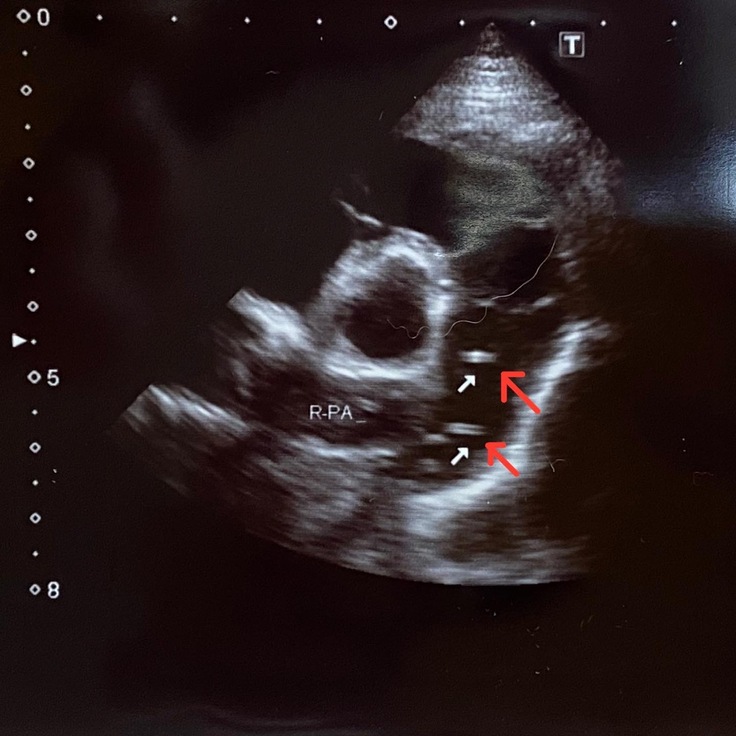 エコー写真を見て発覚したのは、フィラリア成虫が右心房から右心室に流れる間にある弁(三尖弁)に大量に絡みついており、弁がしっかり閉じられていないという状態になっていました。
