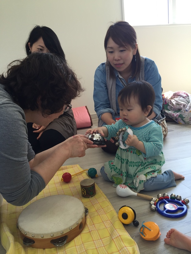 じーーーっとカラフルな色を見つめる初めてベビー、先生の声よりもキーボードに夢中な子、チョウチョをマリオネットのようにひらひら演じさせて楽しむ子、宙に舞うひらひら布に歓声をあげる子、持ちやすいいろんな音の楽器の感触や音色を楽しむ子…みんなそれぞれの楽しみ方があって、それぞれに感じながら体験することができたように思いました。