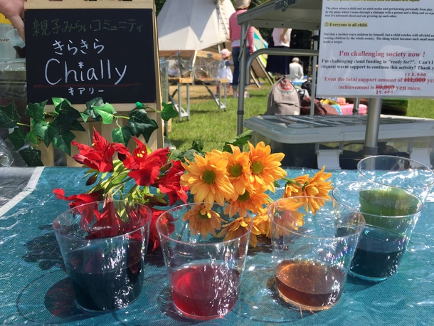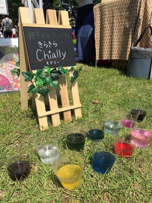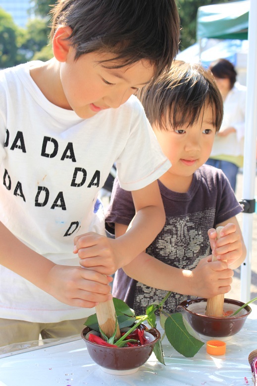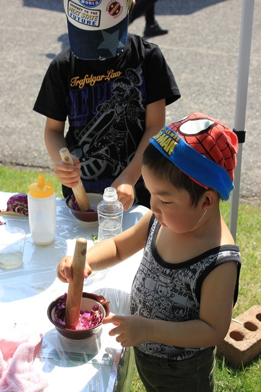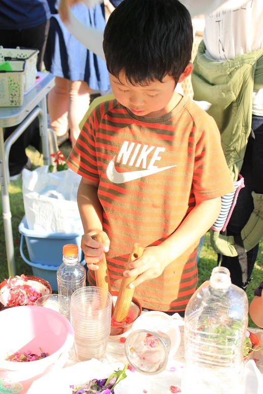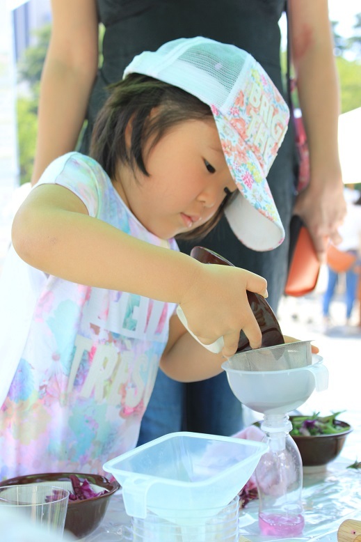 あそびあいらんどブースでは、たくさんの草花を使って色水遊びを楽しみました。