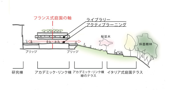 アカデミック・リンク松戸は、「フィールドとコンテンツと学習の近接」によって、知識基盤社会を生き抜く「感性に優れた考える人材の創造」を目指して計画され、幸いにも文部科学省の施設整備費が認められました。この理想を実現するために「庭園と