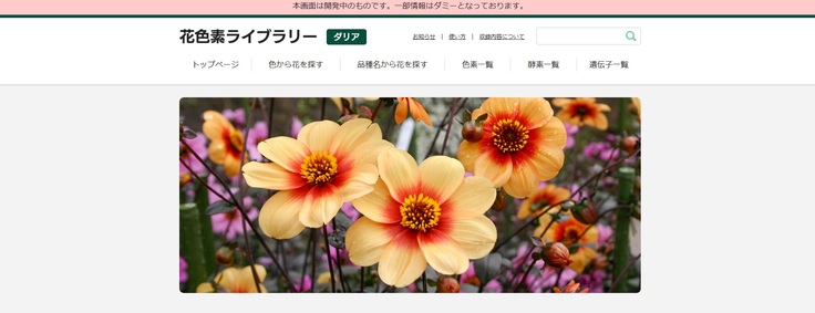 「オンライン園芸植物ライブラリー」の「花色素ライブラリー」を12月13日公開しました(https://www.cu-hort.com/index.html)。現在建設中で、ダリアの3品種しか登録されておりませんが、花色から品種を探すことができて、当該品種の花色素、色素の化学式、生合成経路、生合成反応に関与する酵素、酵素合成を支配する遺伝子まで総合的に知ることができます。本ライブラリーは、植物の形質発現に関する学生の専門教育に使われるほか、園芸学研究科で行われている植物ゲノム研究の成果を公開することによって、新たな育種・植物利用に関するオープンイノベーションを促そうとするものです。また、一般の方向けには、花色から品種を探して栽培法がわかることで、庭や花壇の設計にも利用していただけます。今後、様々な種・品種の充実を図ってまいりますので、ご期待ください。