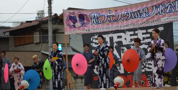 病気で家に引きこもりがちだった、佐藤康子さんは千葉市原を題材に「市原小唄」を作詞、作曲、振付をしました。市原文化祭民謡まつりで、お友達とお披露目です。浴衣姿のいなせな男衆も傘をもって参加です。共演した高校生君は「めっちゃ楽しい!」とはしゃいでいました。佐藤さんは目を細めて、「長生きしていてよかった」とおっしゃっていました。
