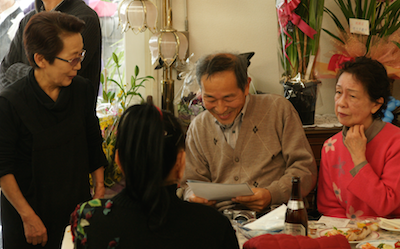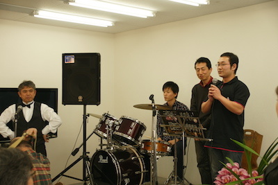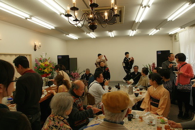 80名ほどのお客さんが、活動拠点の萬花園の開店パーティーでご当地ソングを楽しみました。元気なお年寄りもいっぱい来てくれました。
