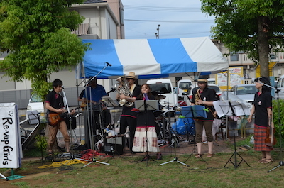 雨の中、電子楽器に気を使いながらもテントの中で”Re-vup”が「ご当地ソング」を演奏しました