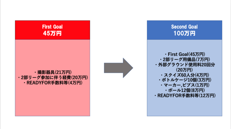 ・SecondGoalの100万円より多くの寄付をいただいた際には、今後の活動資金(遠征費や公式戦時使用サプリメントなど)に充てさせていただきます。