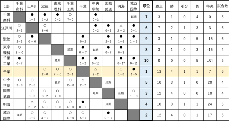 それらの現実を受け止め、臨んだ今シーズン。第3節の明海大学、第4節の中央学院大学戦など関東リーグ参入戦に参加するような強豪校から勝ち点をもぎとり、近年実力が拮抗している大学にも第6節終了現時点では勝ち切ることができました。しかしこれらを継続しなければ上位校との差は埋まったとは言えません。