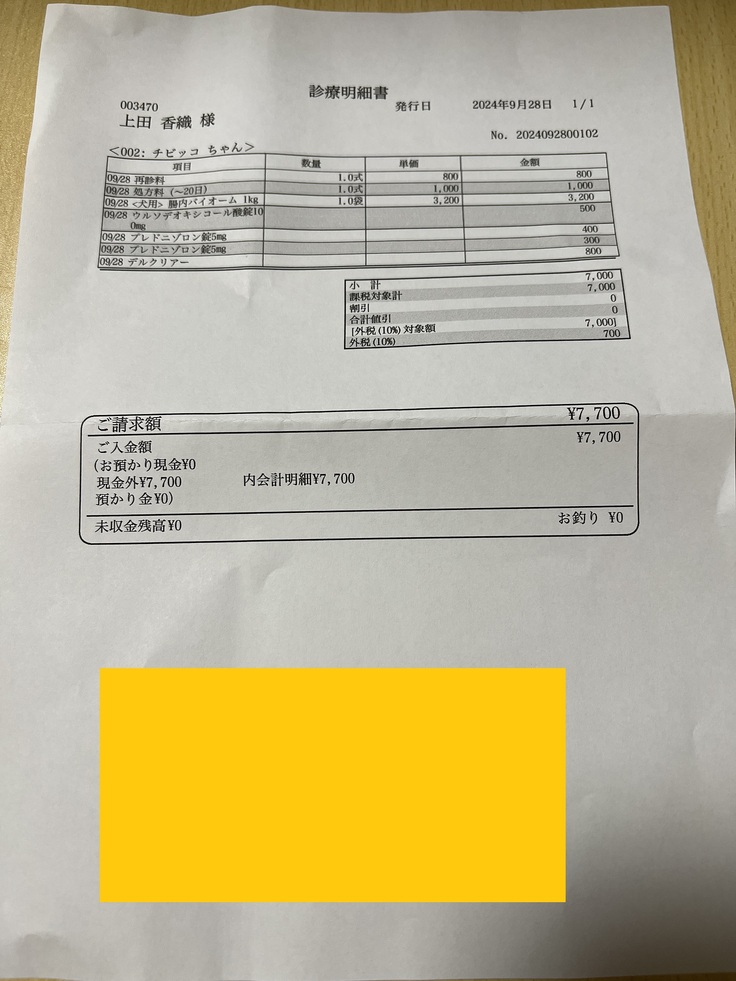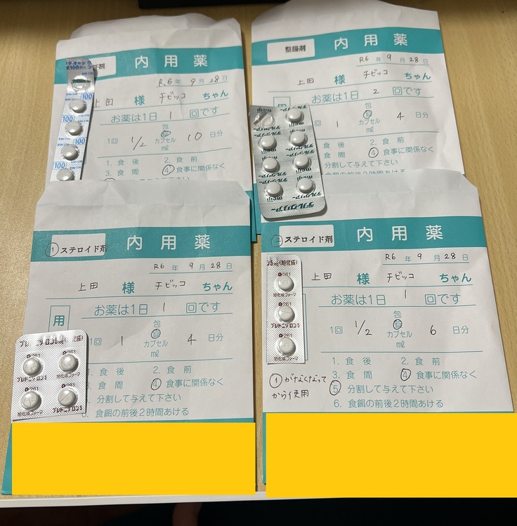 6.7kgあった体重も5.8kgまで落ち、担当獣医師からまず下痢を止める治療優先にしましょうとのことで、ステロイド1/4だったものを1錠に復活・ステロイドで胆嚢粘液嚢腫悪化を防ぐため強肝剤の復活・整腸剤・腸を整える療法食(診察時にサンプルで獣医師が出したところ食べてくれたので)を処方いただきました。