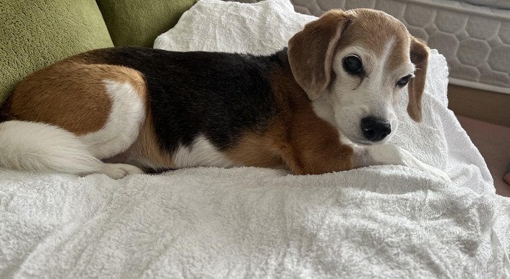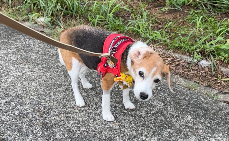 ステロイド剤の副作用で特に後ろ足の筋力が落ちているので、フラっとすることがしばしばありますが、しっかりサポートしながらクン活してもらっています。