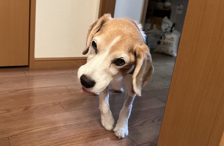 (↓家事をしていたら私の後ろを付いてきたちびっこ。右目のショボショボはやはり鶏アレルギーのようでササミは中止になりました)