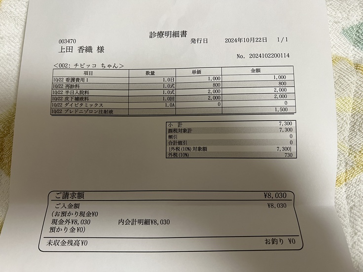 今日は下痢がなかったということで、半日入院による免疫抑制剤の治療と療法食の効果・二日置きの点滴&ビタミン剤治療・内服薬によって少しづつ体が整ってきたのかもしれないなということでした。