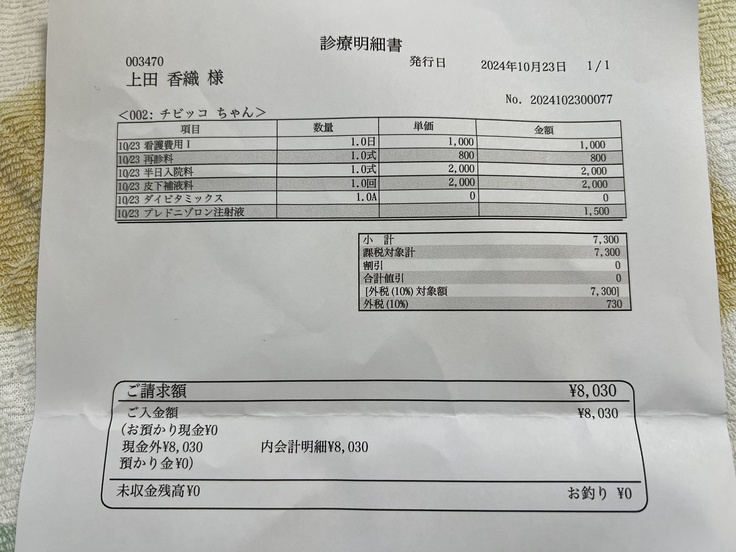 体重→10/22 4.70kg 10/23 4.90kg (恐らく点滴で少し増量したと思われます)