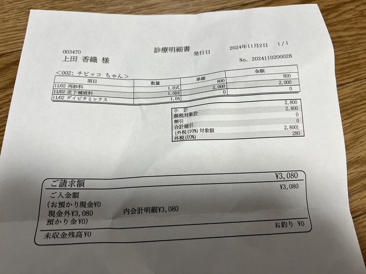 (担当獣医師はお休みの為、代打獣医師に診てもらいました)