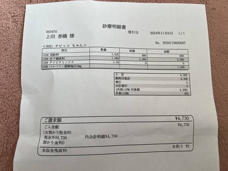 今日は動物病院の診察の日だったので獣医師に下痢の頻発が始まった事を話し、いつもの脱水に対する点滴にビタミン剤と下痢止めも一緒に打ってもらいました。