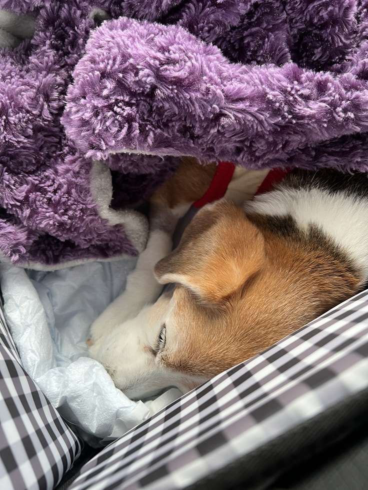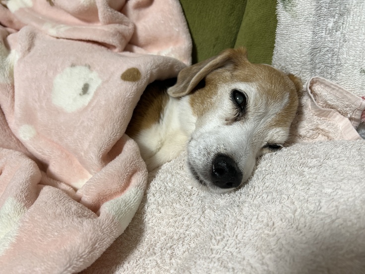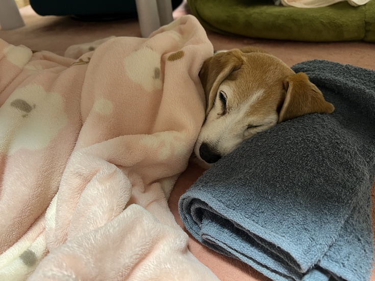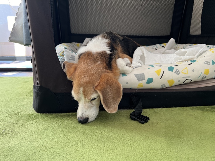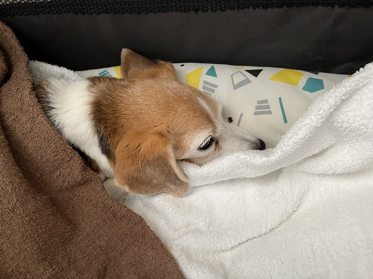 動物病院から帰って来たちびっこは疲れ切っており自分のベッドまで歩いて行けず、テーブルの下にへたり込んでしまいました(テーブルの下のために安易に動かせず、少しずつ移動してベッドに連れて行きました)