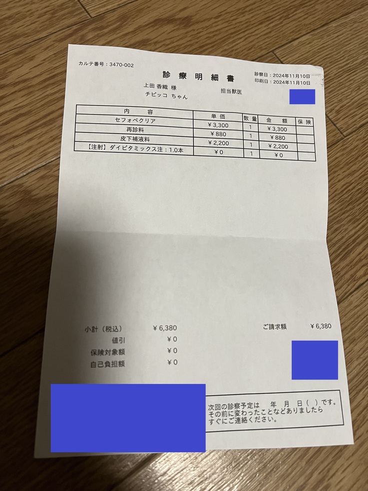 ちびっこは2日に1回の診察+点滴に来ていましたが、長い待ち時間と我慢できない下痢が辛そうで、獣医師と相談をして3日に1回の通院に変更になりました(次回の診察予約 11/13日)