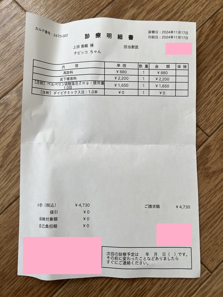 点滴+ビタミン剤+下痢止めをしてもらってる間、私の気持ちが落ち着いているうちに獣医師に亡くなった後のケアの仕方を聞きました(初めての看取りでパニックになりそうだったので💦)