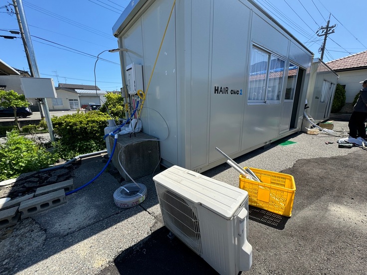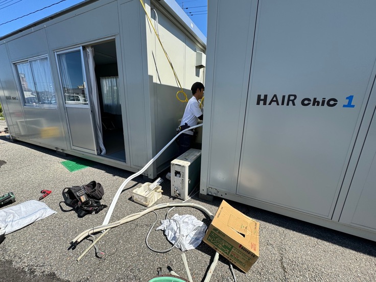 chic本店の現在は工事の日程もまだ決まっていませんが、始まった時の準備にお借りしたエアコンや壊れた家屋の使わないエアコンもいただき取り付けてもらいました。