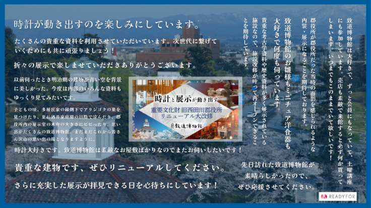 致道博物館自身も、大時計の修理と展示リニューアルは悲願であると同時に、皆様にご覧いただけることを楽しみにしております。旧西田川郡役所が、ここにあり続けることを願う気持ちを、皆様と共有できていることにこの上ない喜びを感じています。