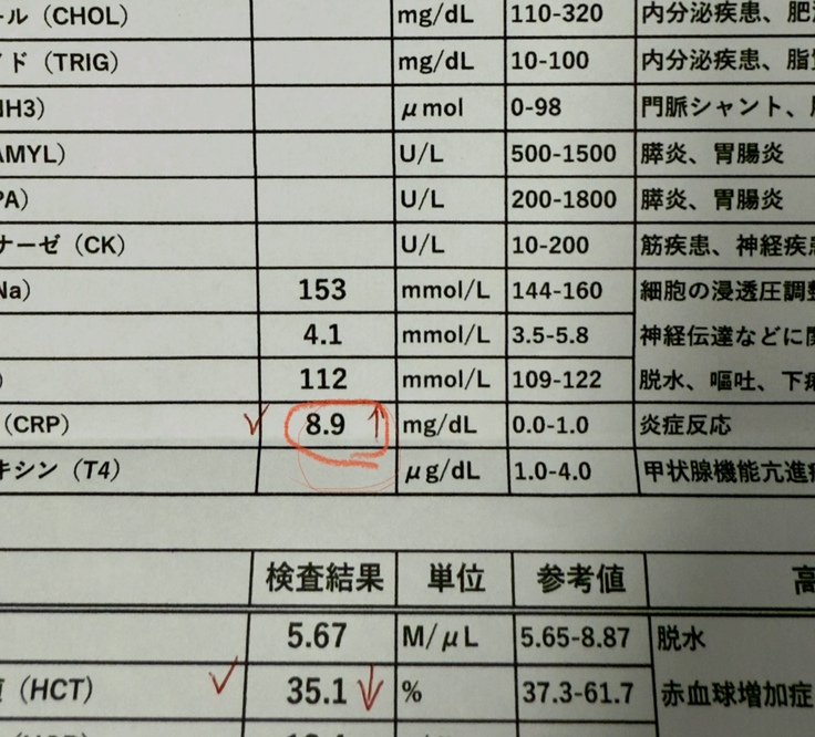 やはりCRPの数値が上がっていて8.9と高く…こんなに高いと本人はかなりしんどいだろうと言われました💦