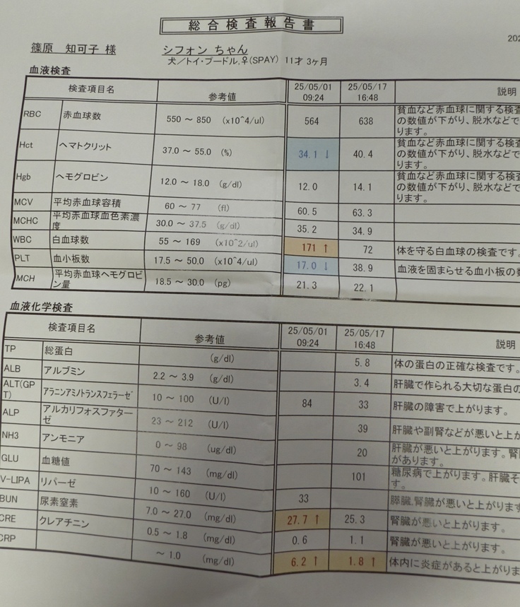 血液検査ではやはりまだCRPの数値は少し高いものの先日の高い数値よりはだいぶ下がっていて炎症止めのお薬は減りました。