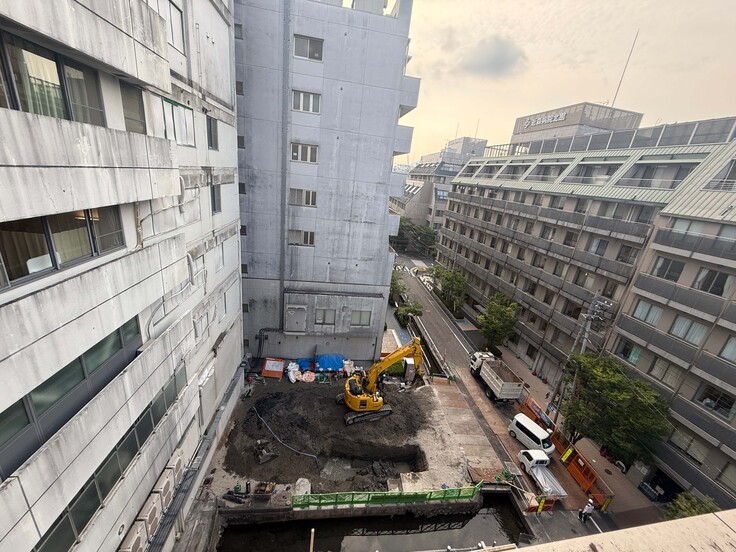 建築現場では薬剤棟の基礎工事の準備を本格的に進めています。本日は、重機で地面を掘削して地中に障害物などが埋まっていないか状況を確認していました。