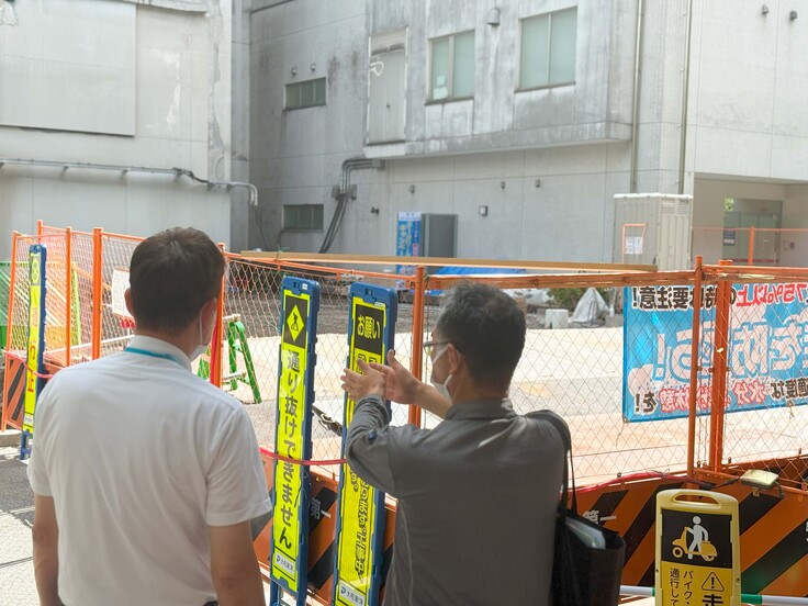 まず、建設予定地に仮囲いが設置され、車道は人の通行を含め一切の通行が禁止となりました。この通行制限は来年6月末まで続く予定です。日頃より道路をご利用されております皆さま、何卒ご理解のほどよろしくお願いいたします。