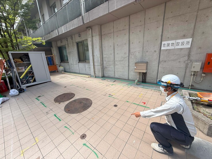 今回の建設プロジェクトの開始は既存設備(地中のオイルタンク)撤去から始まっています。移設前のオイルタンクの場所を尋ねたところ、緑枠で囲ったところの地中にあるそうです。地上からは全然わからないものですね。