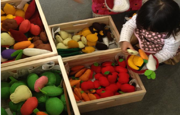 (子どもたちは、フェルト玩具を使って八百屋さんを開いたりと遊んでいます。)