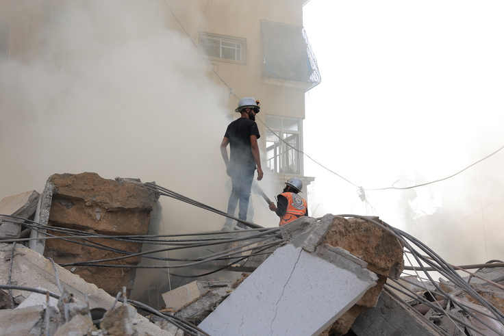 パレスチナ・ガザ地区にて、攻撃により倒壊した建物と救出活動をする人々の様子
