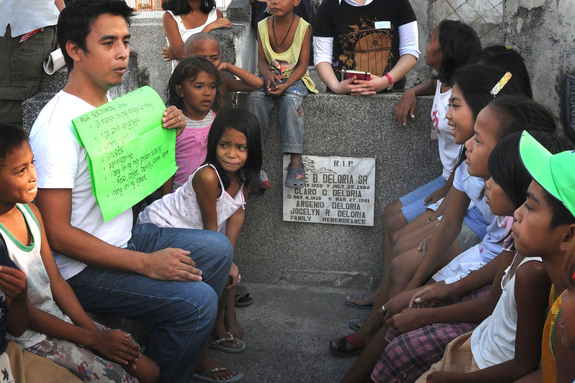 (墓地に暮らす子どもたちに衛生について教えるストリートエデュケーター)
