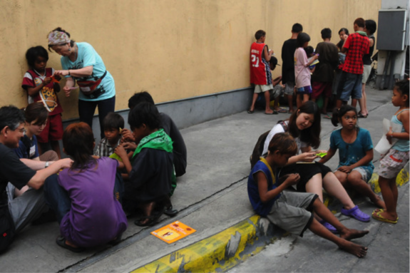 (日本人のボランティアに折り紙を習うストリートチルドレン)