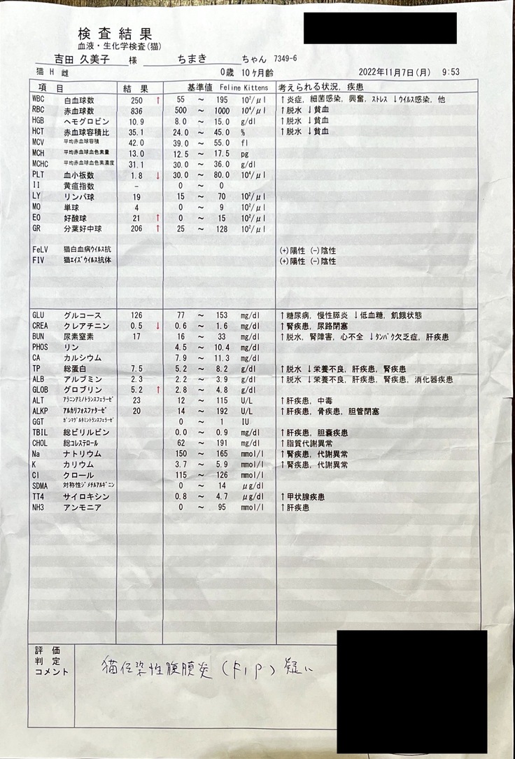 検査結果と症状を見て主治医の診断はほぼFIP確定とのことでした。