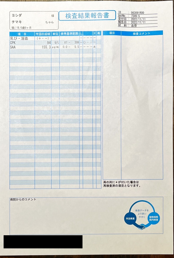 FIPの疑いの診断がおり、詳しい検査依頼