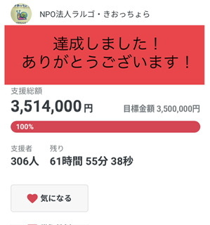 募集期間の残り61時間という段階で、目標額の3,500,000円を突破しました!!!!!!!!