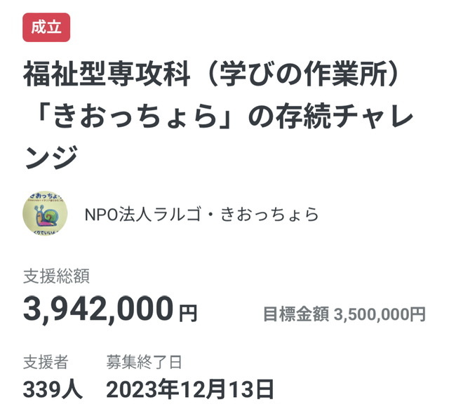 おとといの朝、目標金額に達した後、この2日間も次々とご支援をいただきました。目標額を大幅に上回る3,942,000円。