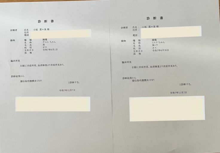 チロルとミルクのFIP(猫伝染性腹膜炎)の寛解を目指します。FIPは病気の進行がとても早く、治療が遅れると死に至る病気です。