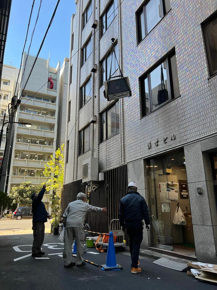 急遽、ウインチで屋上から吊って搬入することになりました。