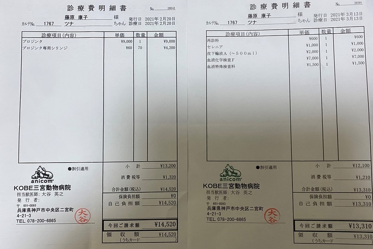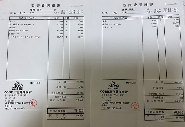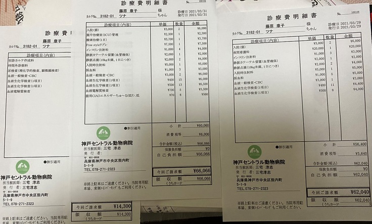 基本的に入院費は一日2万ほどですが、ツナの状態によって夜間看護料が発生したり、医療機器の使用料で3万になる事もあります。