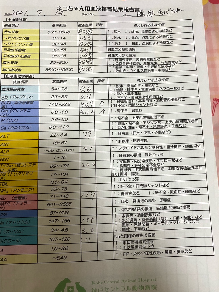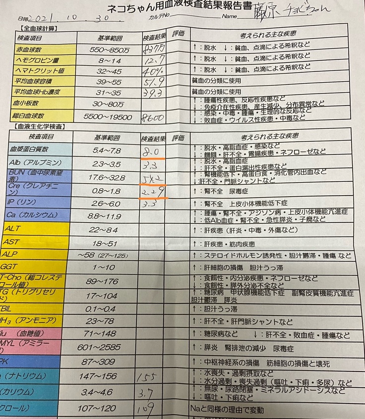 結果、腎不全の数値が悪化傾向にあり、排せつ状況(排便はあるものの、常にお腹の中に便が溜まっています)も思わしくない事が分かりました。