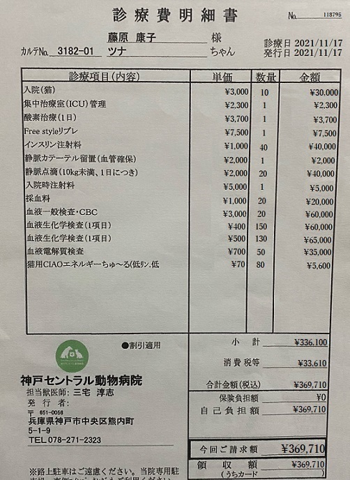 ツナの入院費は一日約3万円ほどで、退院後は月1万円ほどかかります。