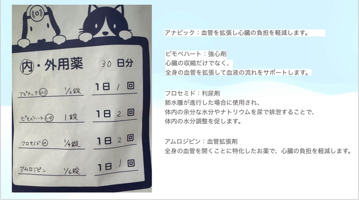 Chocoが今穏やかに過ごせているのは、アナピック、ピモベハート、フロセミド、アムロジピンという4種類のお薬のおかげです。しかし、これらの薬は腎臓に負担がかかり、副作用によって命を落としてしまうリスクもあります。