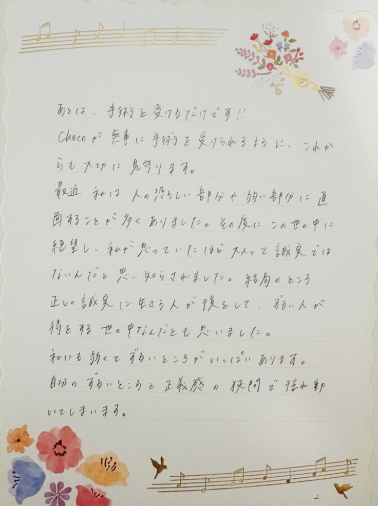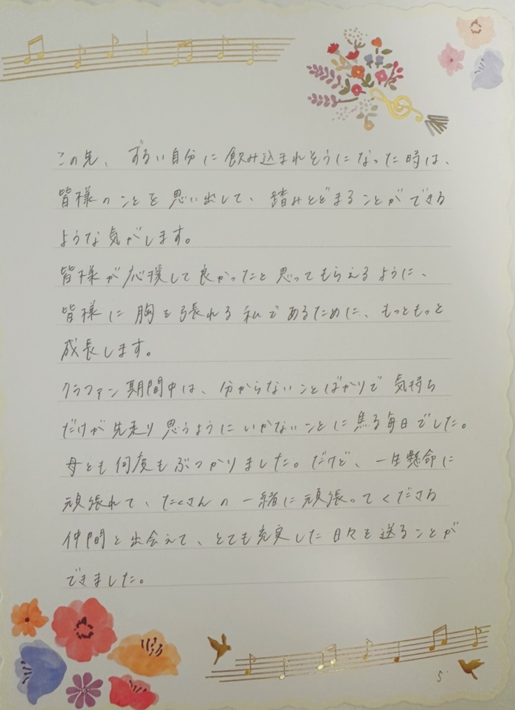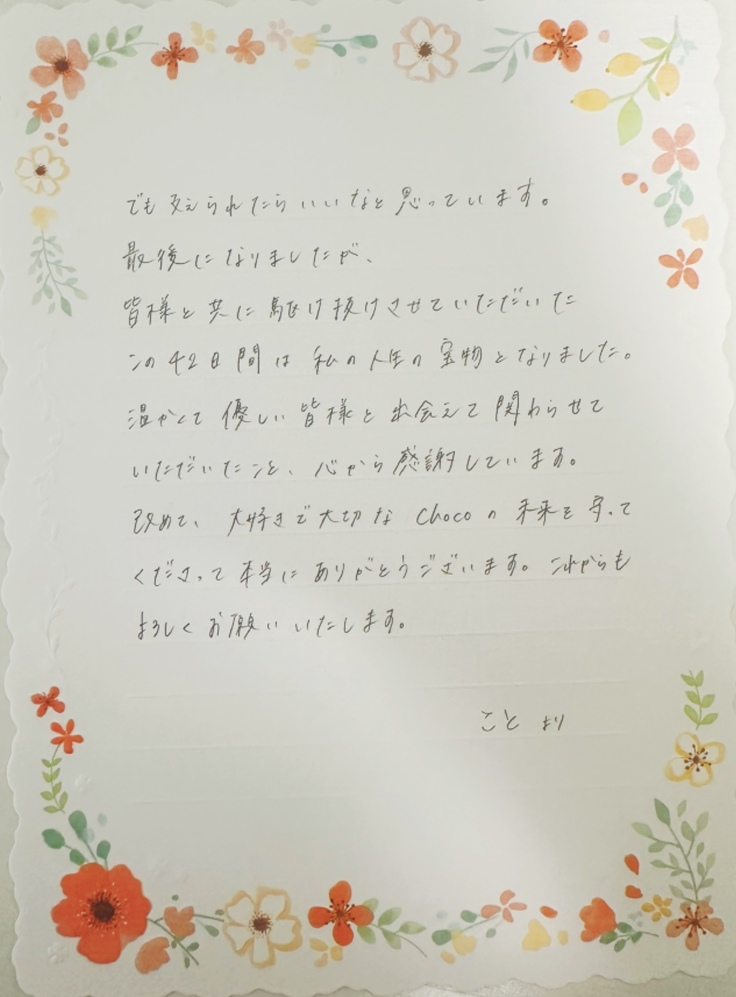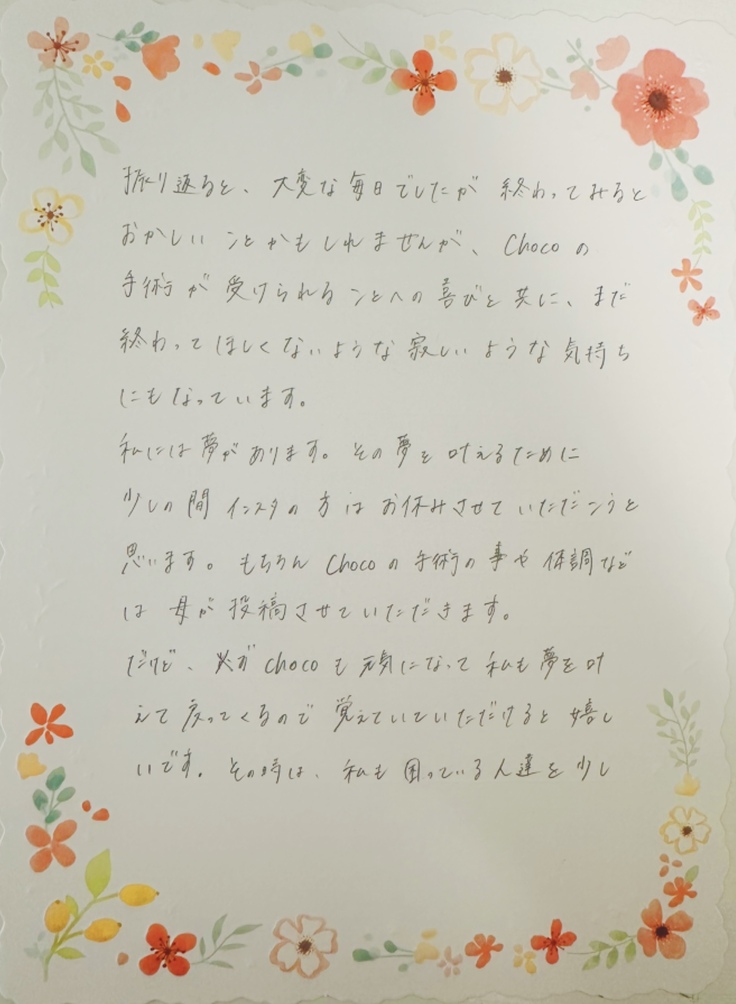 皆様への感謝の気持ちと今の私の気持ちを書かせて頂きました。