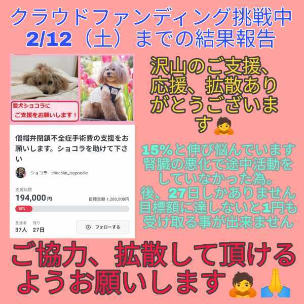 ※⑧リンク分かる方はクラファンのリンクお願いします。クラファンはREADYFORで、「愛犬ショコラ」で検索すると出てきます。