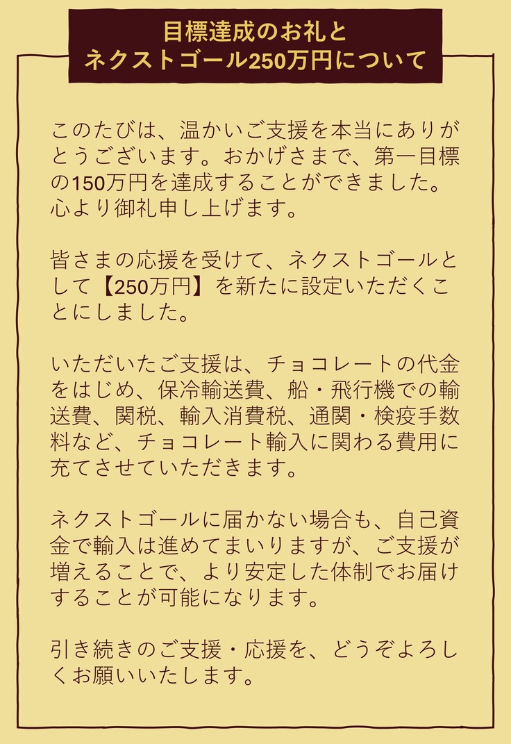 輸入停止から1年以上が過ぎ、涙ながらのお電話をいただくこともありました。それほど、私たちのチョコレートは、お客様の”希望”になっていたのです。