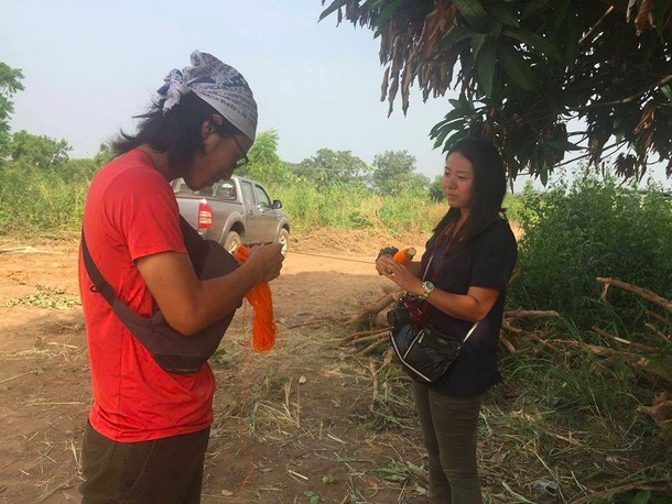 ガーナ学建設プロジェクト、作業はいよいよ図面から敷地へと校舎位置が転写。漁業用の網をほどいて使い、敷地にラインを引きます。