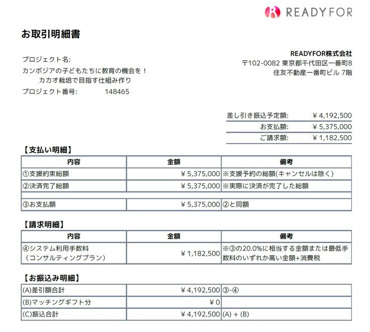 ReadyForさんの手数料と手数料の消費税が差し引かれた「4,192,500円」が