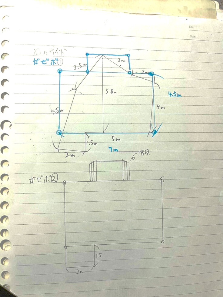建設するガゼボは農園にある岩を囲うように柱を設置し、岩の上に床部分がくるイメージなので、今回はより詳細に岩の形状と寸法を測り、現場で(非常に簡単ですが...)手書きで図面を描きながら業者さんと打合せをしてきました。