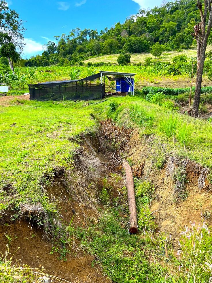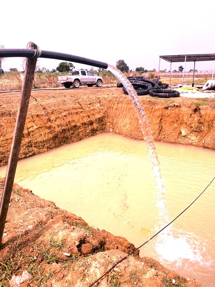 3月に井戸の掘削作業が完了した契約農家さんの農園では、灌水設備の敷設工事がゆっくりとではありますが着実に進んでいます。現在は井戸から汲み上げた水を大きな溜め池に移す段階で、この先ソーラーパネルやモーターを設置し、パイプとホースを農園全体に敷設していきます。