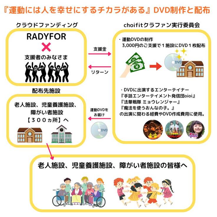 choifitクラウドファンディング実行委員会が、支援金約60万円で楽しい運動DVDを300枚作成し、30万円で郵送費や運営費として使い、つながりのある団体や施設へ送付する。