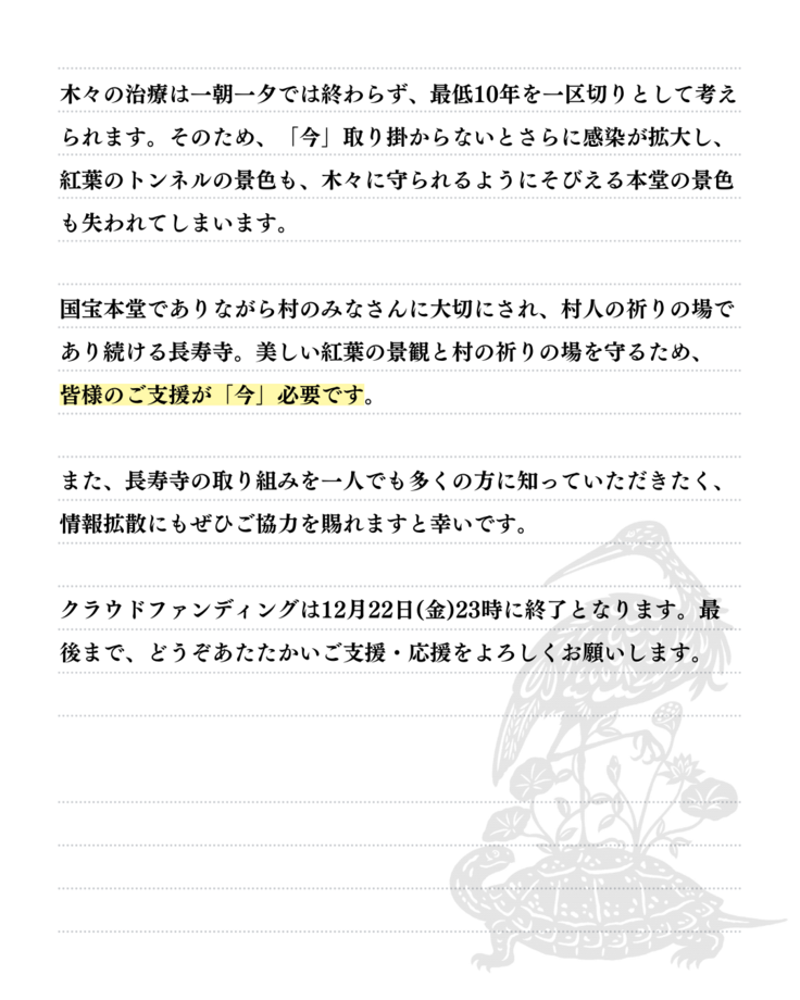また、長寿寺の取り組みを一人でも多くの方に知っていただきたく、情報拡散にもぜひご協力を賜れますと幸いです。
